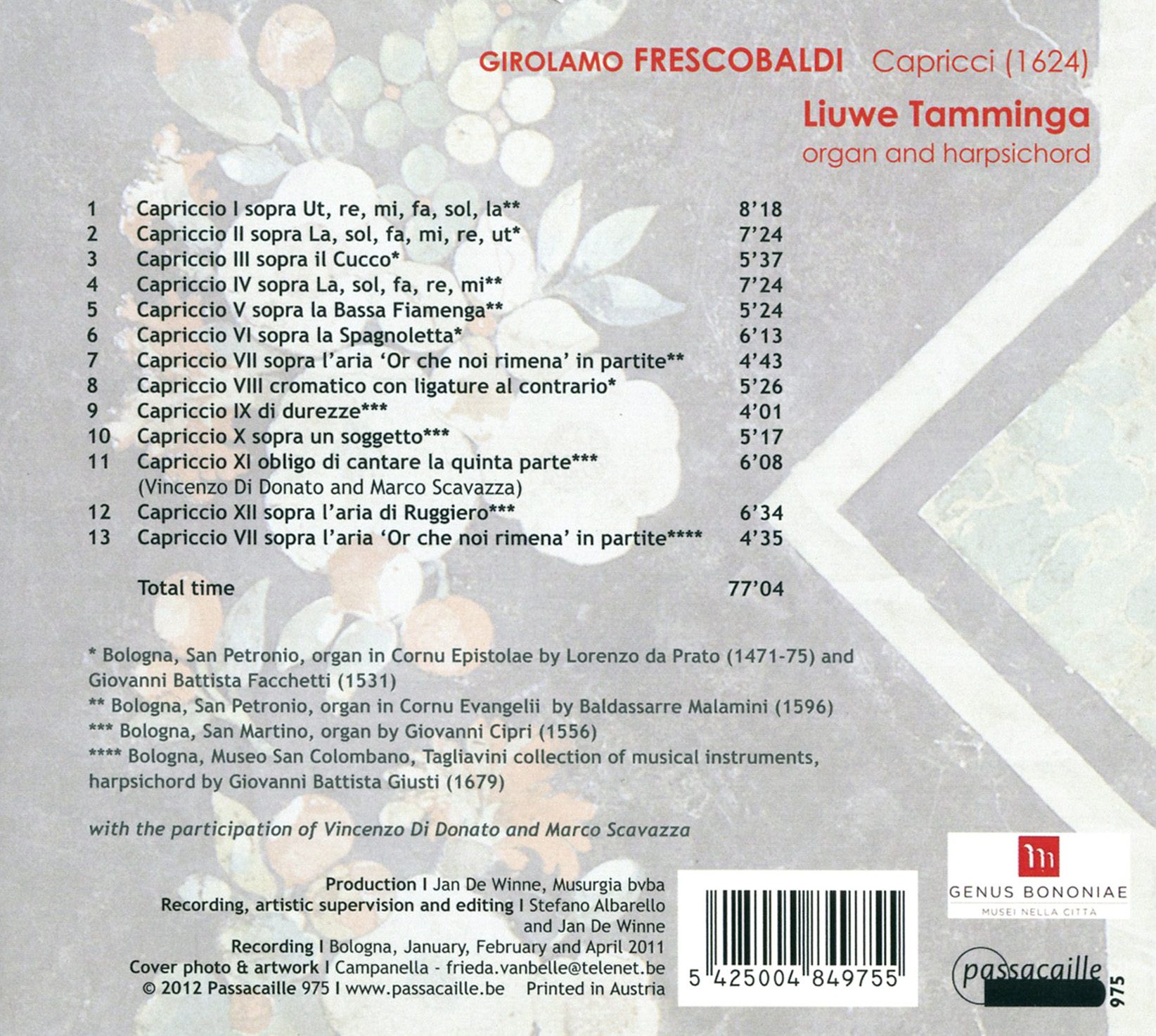 Once again Liuwe Tamminga celebrates the magnificent sound of some of the oldest surviving organs of Italy. He performs Frescobaldi on the amazing organ made by Lorenzo da Prato (1471-75) but also on the Baldassarre Malamini (1596), organ both situated in San Petronio.He also uses the organ by Giovanni Cipri (1556) in the nearby church of San Martino as well asa harpsichord by Giovanni Battista Giusti (1679).