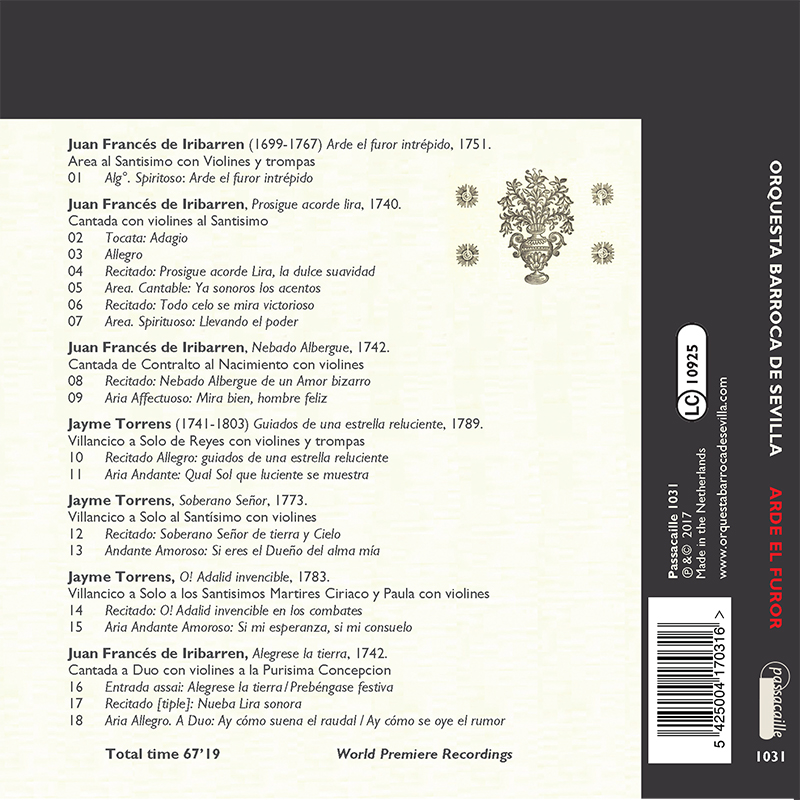 Cet enregistrement magistral nous offre en première mondiale plusieurs cantates et villancicos de Juan Francés de Irribaren, et de son élève et successeur comme maître de chapelle à la cathédrale de Malaga Jayme Torrens, qui à eux deux couvrent la totalité du siècle, passant du style galant très vivaldien (et napolitain) du premier, au classicisme quasi-viennois du second, dans des airs qui, pour être écrits sur des textes sacrés, n’ont absolument rien à envier aux créations les plus virtuoses et avant-gardistes de leurs époques respectives.