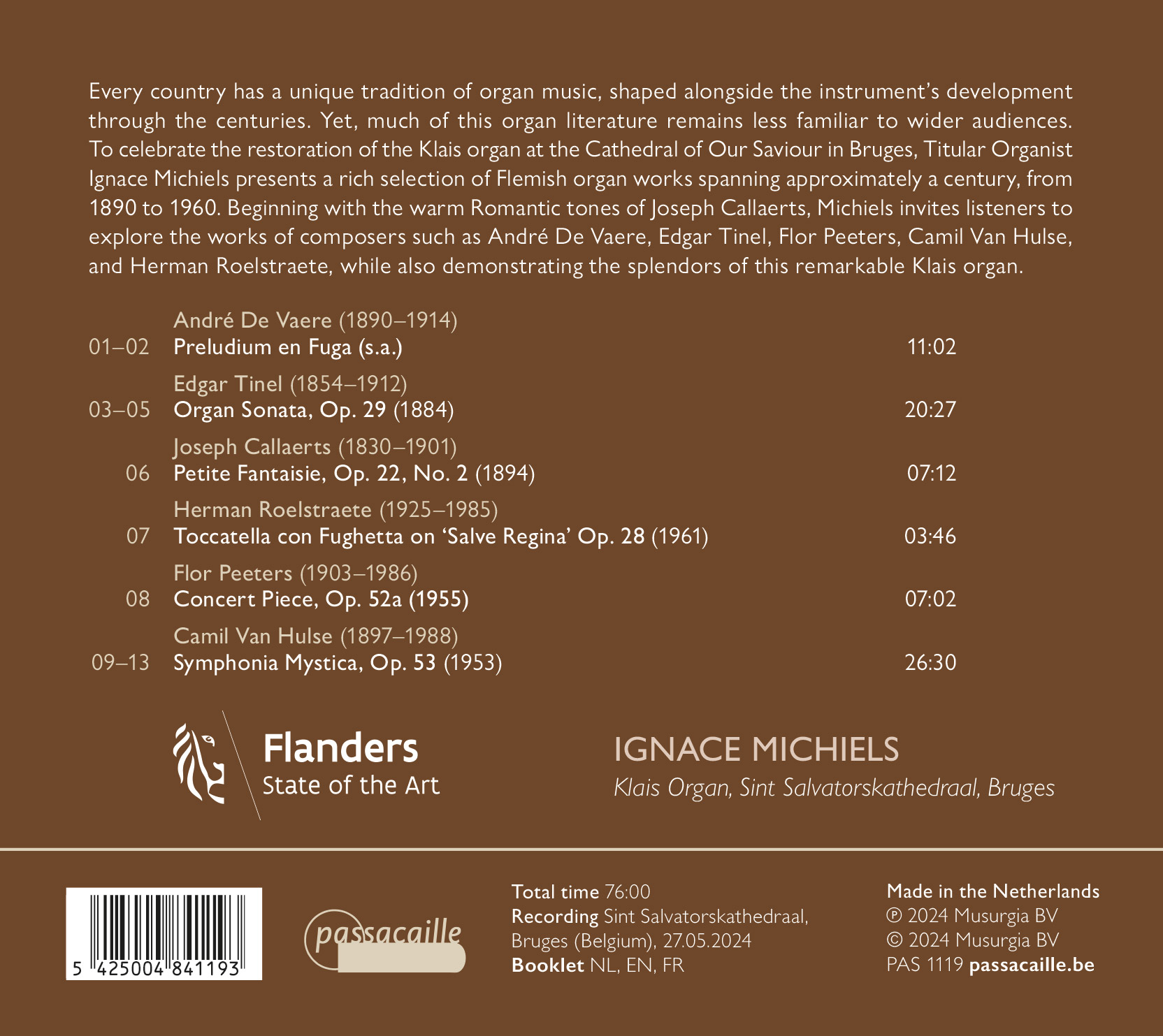 Chaque pays possède une tradition unique de musique d’orgue, façonnée en parallèle avec le développement de l’instrument au fil des siècles. Pourtant, une grande partie de cette littérature d’orgue reste moins connue du grand public. Pour célébrer la restauration de l‘orgue Klais de la cathédrale Saint-Sauveur de Bruges, l’organiste titulaire Ignace Michiels présente une riche sélection d’œuvres pour orgue flamandes s’étendant sur environ un siècle, de 1850 à 1960. En commençant par les chaleureux accents romantiques de Joseph Callaerts, Michiels invite les auditeurs à découvrir les œuvres de compositeurs tels qu’André De Vaere, Edgar Tinel, Flor Peeters, Camiel Van Hulse et Herman Roelstraete, tout en démontrant les splendeurs de ce remarquable orgue Klais.