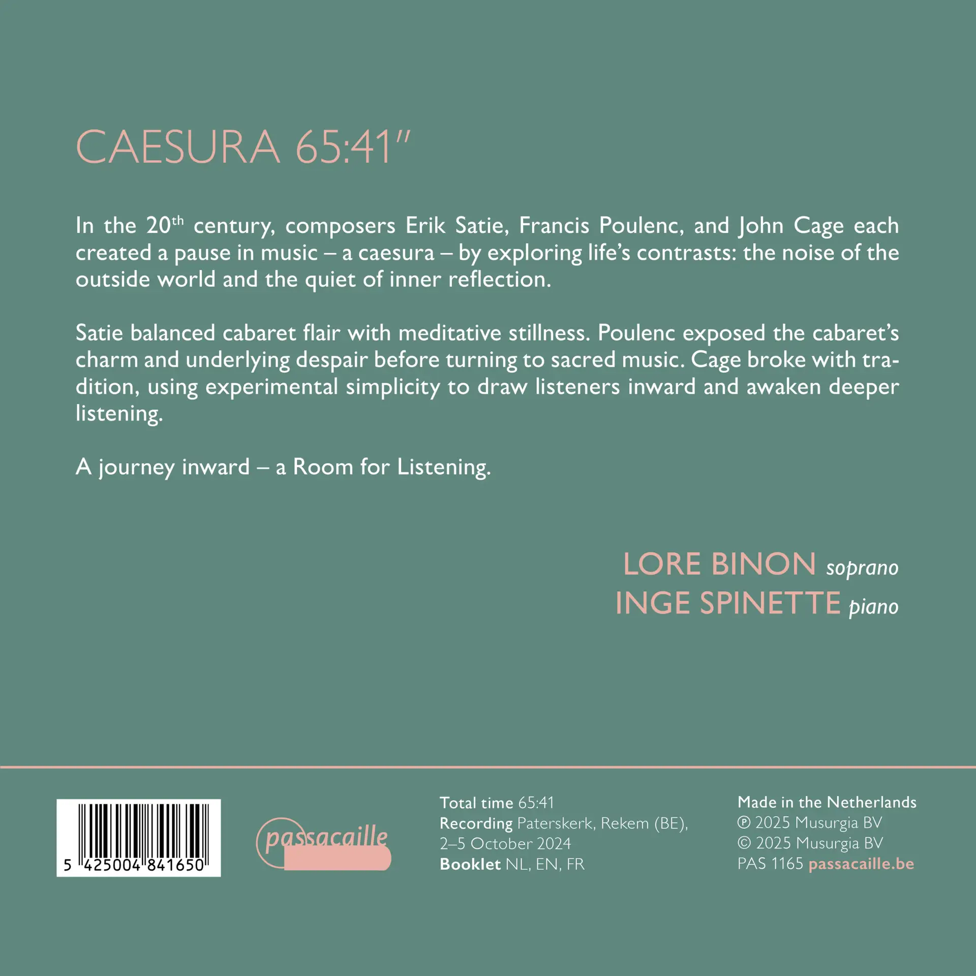 In de twintigste eeuw creëerden componisten Erik Satie, Francis Poulenc en John Cage elk een stilte in de muziek—een caesuur—door de contrasten van het leven te verkennen: het lawaai van de buitenwereld en de stilte van innerlijke reflectie.
