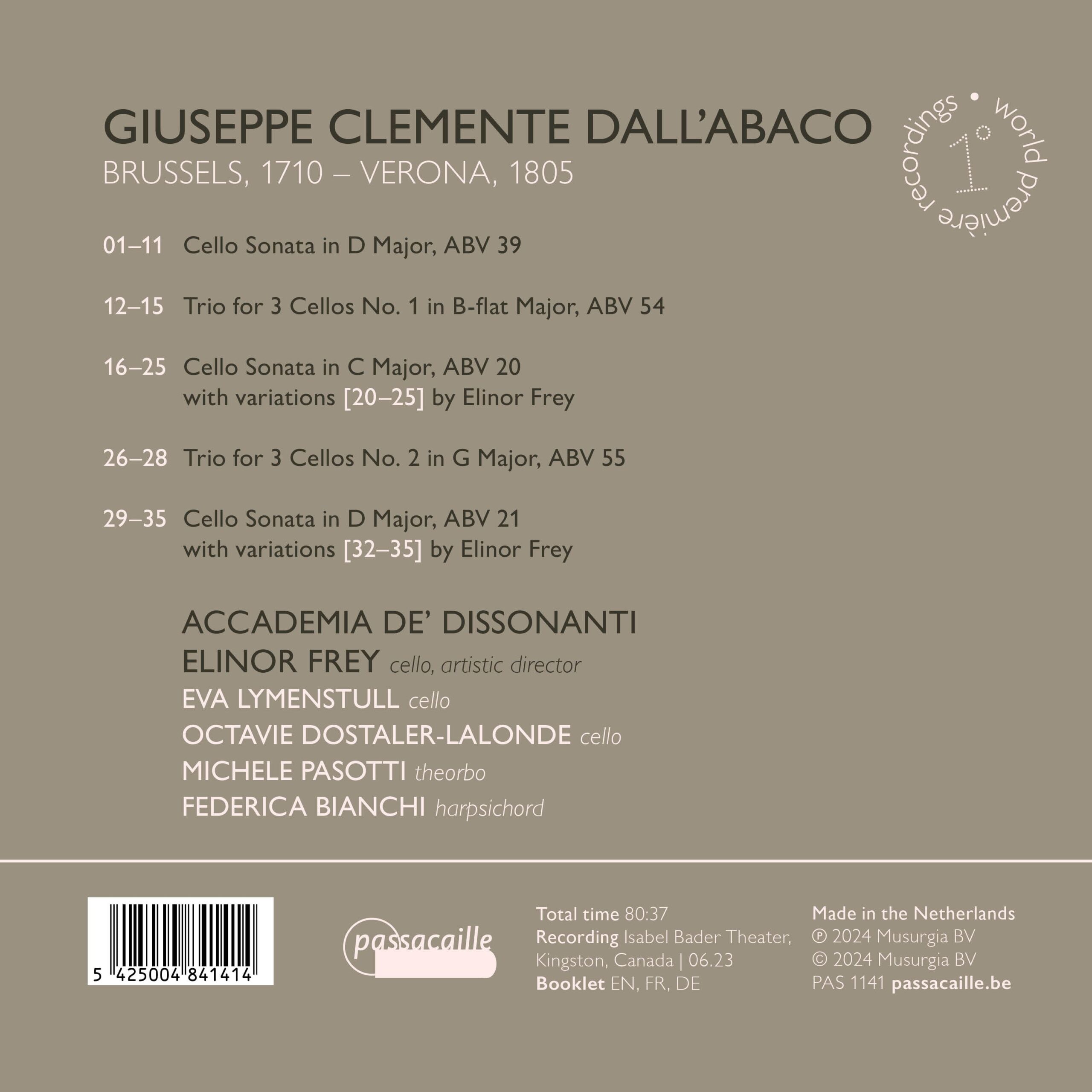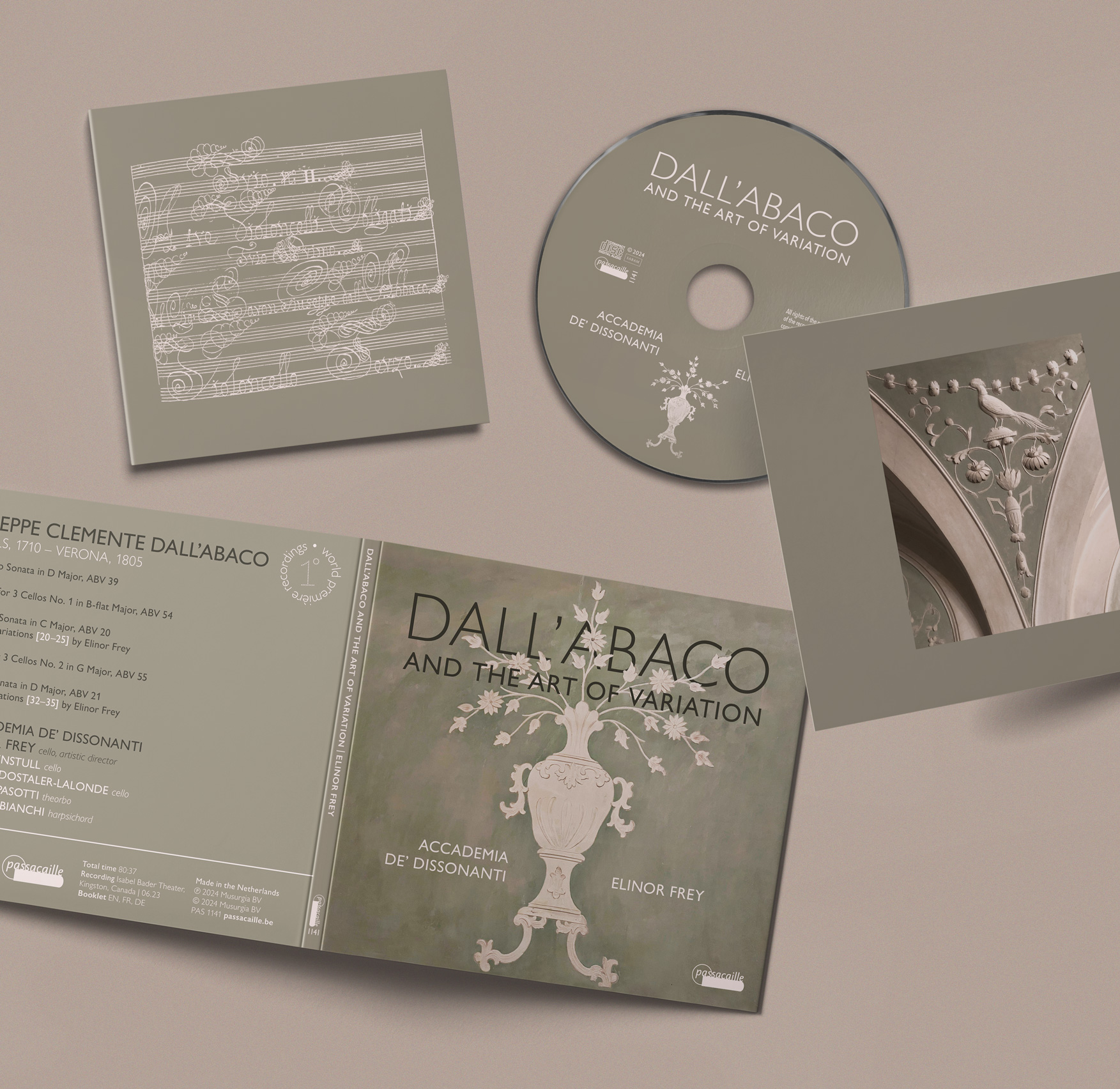 Celliste Elinor Frey heeft de afgelopen jaren gewerkt aan het onderzoeken, opnemen en publiceren van de opmerkelijke cellomuziek van de 18e-eeuwse virtuoos Giuseppe Clemente Dall’Abaco. Haar cd “Dall’Abaco: Cello Sonatas” , uitgebracht in 2020, werd bekroond met de prestigieuze Diapason d’or en haar cd “The Cello According to Dall’Abaco” (2022) kreeg een “cum laude” in het tijdschrift Luister. Haar nieuwe album over de muziek van Dall’Abaco verkent de barokkunst van de variatie aan de hand van twee cellotrio’s, uitgevoerd met Eva Lymenstull en Octavie Dostaler-Lalonde, en drie cellosonates, met Michele Pasotti en Federica Bianchi. In elke sonate bestaan de laatste delen uit een thema gevolgd door een reeks variaties. Deze variaties geven de componist of de uitvoerder de ruimte om het stuk verder te ontwikkelen door interessante nieuwe gesturale figuren te creëren in de solocellopartij, terwijl dezelfde baslijn en harmonieën gebruikt blijven worden. Sonate ABV 39 bevat een reeks variaties geschreven door Dall’Abaco, terwijl sonates ABV 20 en ABV 21 bevatten variaties gecomponeerd door Elinor Frey. Variatiesets zitten meestal vol virtuoze gebaren en ingenieuze melodische creaties. Tegelijkertijd verkent het album de subtiele variaties in geluid tussen cello’s en cellisten onderling.