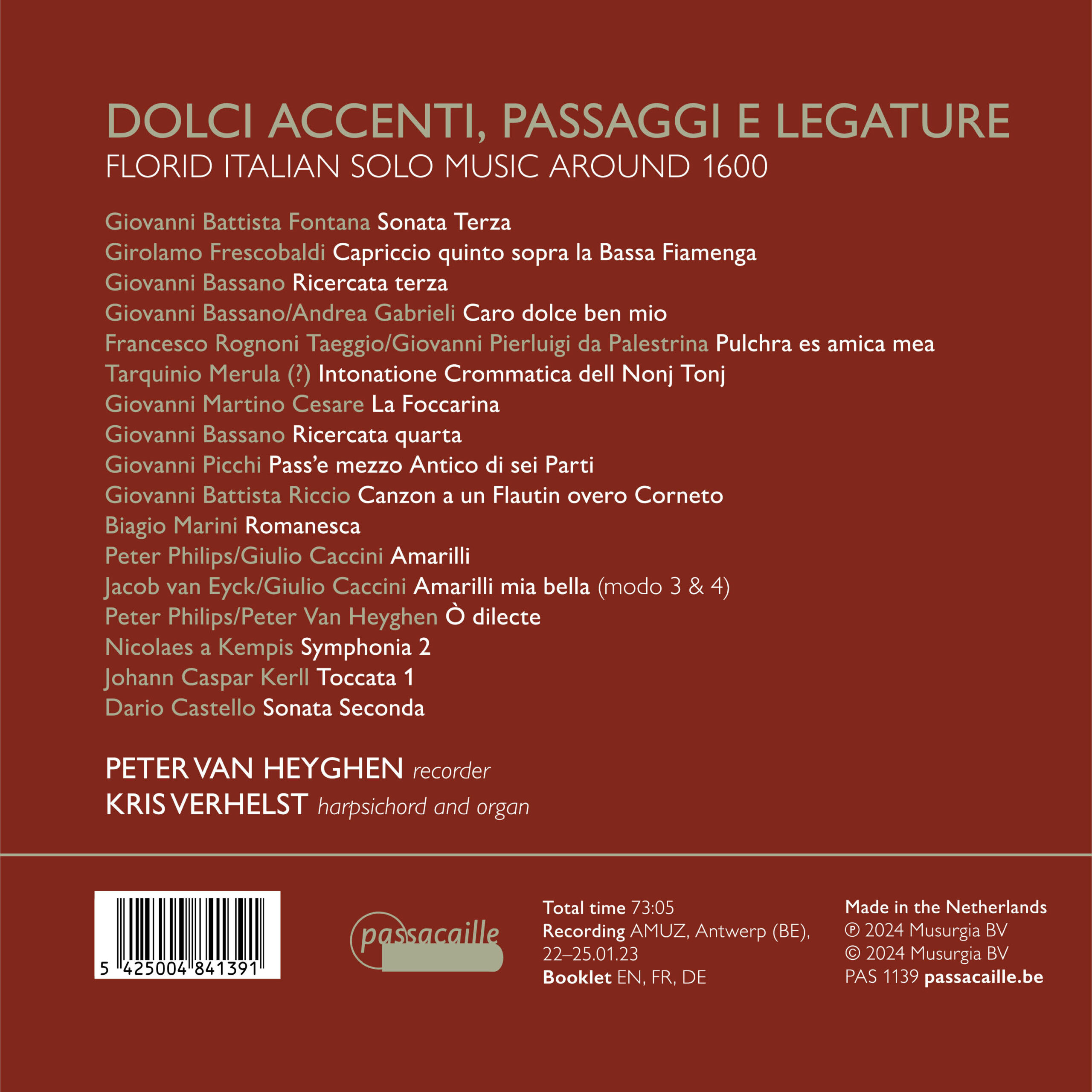 Contrasterende affecten, verleidelijke vocaliteit, moeiteloze virtuositeit en een voorkeur voor het intieme: dit zijn enkele van de kenmerken die de Italiaanse muziek uit de jaren 1600 bijzonder aantrekkelijk maken. Peter Van Heyghen en Kris Verhelst, twee toonaangevende specialisten op dit gebied, hebben hun nieuwste opname aan deze muziek gewijd. Ontdek en geniet van hun bloeiende selectie van sierlijke motetten en madrigalen, liedvariaties, ricercars, toccata’s, intonaties, capriccios, canzones en sonates, uitgevoerd op zorgvuldig uitgekozen historische instrumenten die aan het repertoire kunnen worden gelinkt (drie blokfluiten, twee klavecimbels en een orgel).