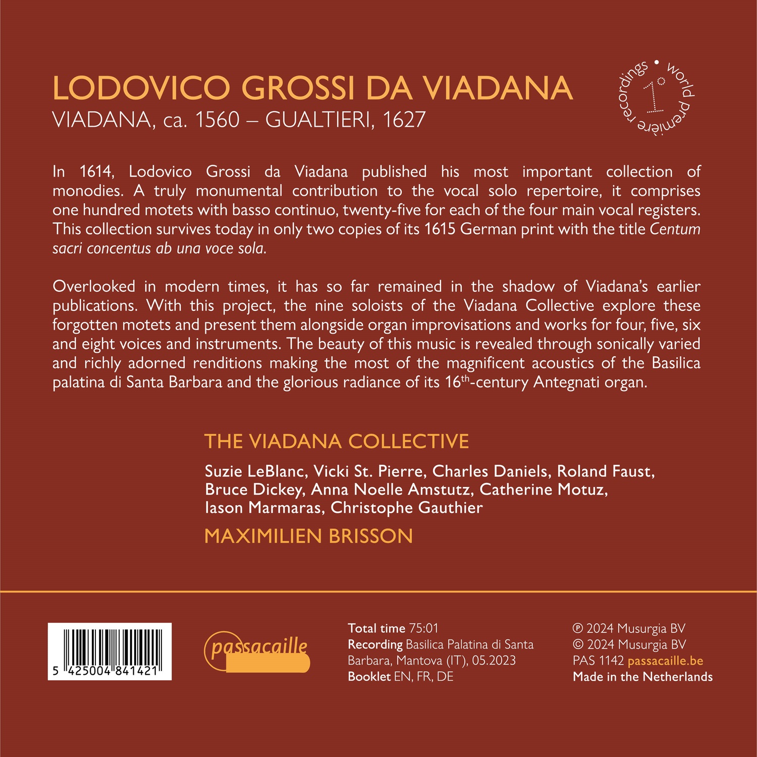 Te weinig bekend in de moderne tijd, is deze collectie in de schaduw gebleven van Viadana’s eerdere publicaties. In dit project verkennen de negen solisten van het Viadana Collective deze vergeten motetten en presenteren ze naast improvisaties voor orgel en werken voor vier, vijf, zes en acht stemmen en instrumenten. De schoonheid van deze muziek wordt onthuld door gevarieerde en rijk geornamenteerde muzikale interpretaties, waarbij optimaal gebruik wordt gemaakt van de prachtige akoestiek van de Basilica Palatina di Santa Barbara en de glorieuze schittering van het 16e-eeuwse Antegnati-orgel.
