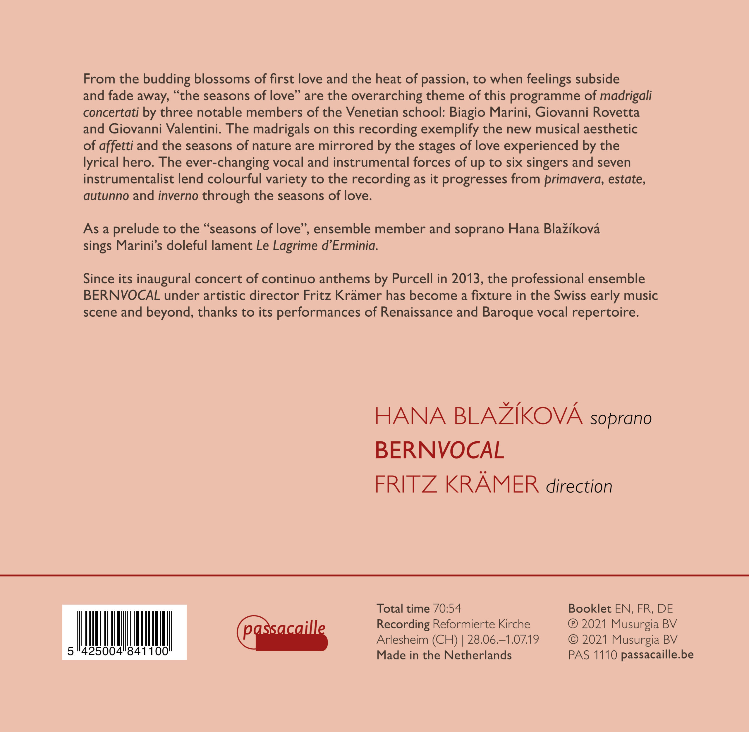 Van de ontluikende bloesems van de eerste liefde en de hitte van de passie, tot wanneer de gevoelens afnemen en vervagen, vormen “de seizoenen van de liefde” het overkoepelende thema van dit programma met madrigali concertati van drie vooraanstaande leden van de Venetiaanse school: Biagio Marini, Giovanni Rovetta en Giovanni Valentini. De madrigalen in deze opname illustreren de nieuwe muzikale esthetiek van de affetti en de seizoenen van de natuur worden weerspiegeld door de stadia van de liefde die de lyrische held doormaakt. De steeds wisselende vocale en instrumentale bezetting van maximaal zes zangers en zeven instrumentalisten zorgt voor een kleurrijke afwisseling in de opname, die van primavera, estate, autunno en inverno de seizoenen van de liefde doorloopt.