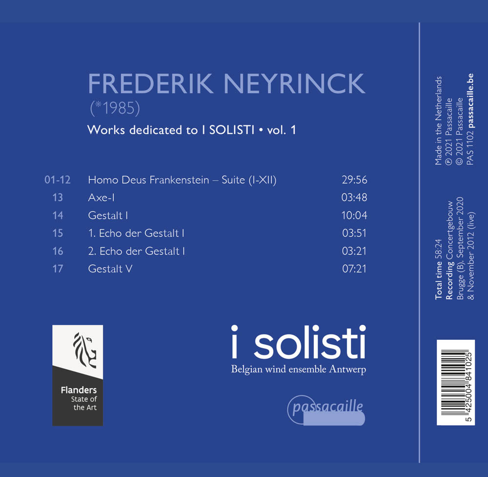 Bij I SOLISTI ontwikkelde Neyrinck zijn affiniteit met blaasinstrumenten – een fascinatie van jongs af aan en een rode draad door zijn hele oeuvre. Hij zoekt steeds naar verfijnde combinaties tussen instrumenten in het ensemble. Deze nadruk op het mengen van timbres van hout- en koperblazers was ook een belangrijke overweging bij het samenstellen van het album en schetst een heterogeen beeld. In Suite Homo Deus Frankenstein (2020) klinkt een speelse en kleurrijke klank, terwijl het abstracte muzikale materiaal in Axe-I (2013), Gestalt I (2011), Gestalt V (2012), 1. Echo der Gestalt I (2011) en 2. Echo der Gestalt I (2011) levert sterk verschillende resultaten op. Daarmee weet dit album de vele facetten van Neyrincks werk te vangen.